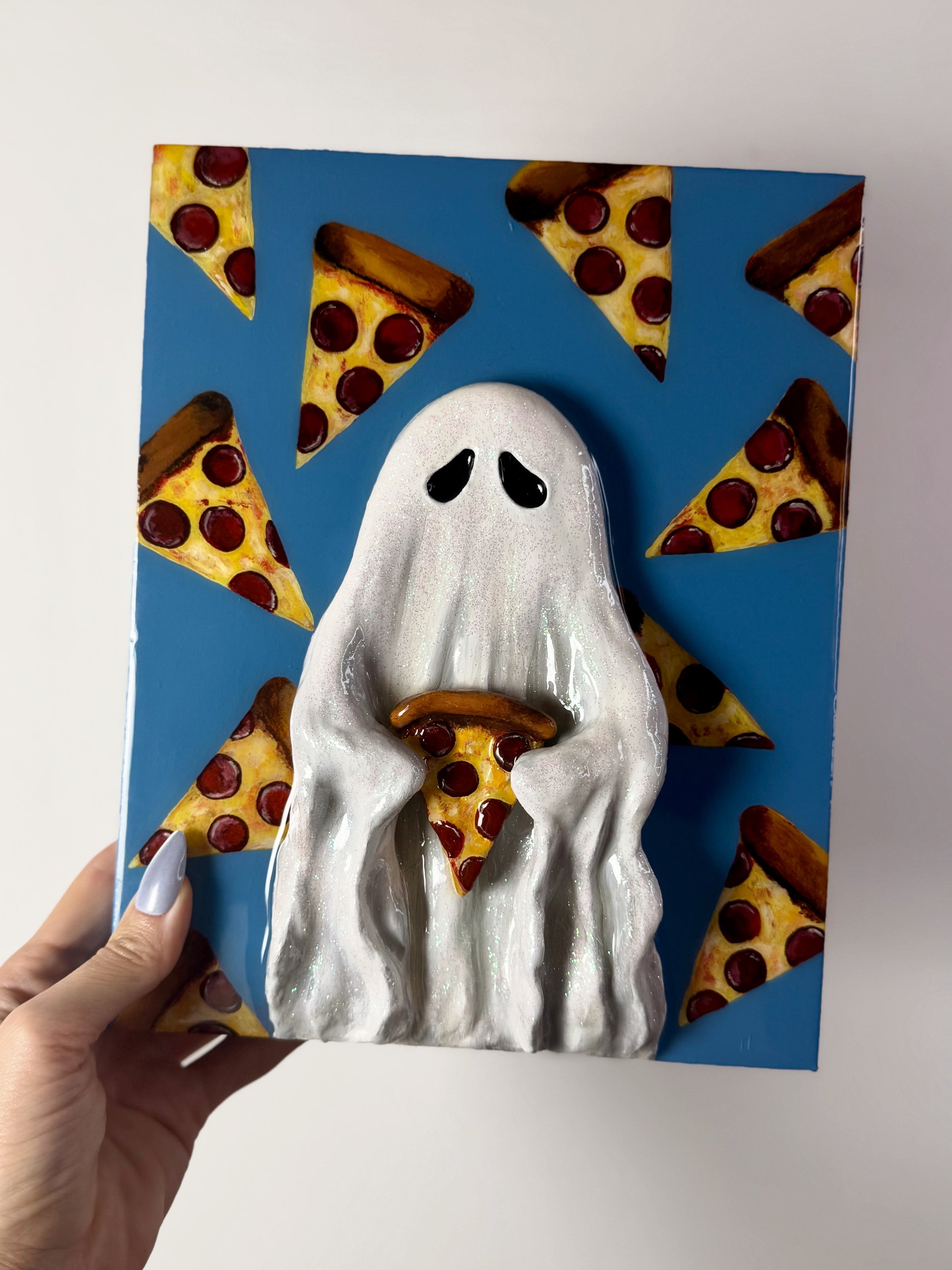Pizza is beloved by everyone for FOREVER! This pizza ghost gives off childhood pizza party vibes and is super cute for spooky pizza loving ghouls and goblins everywhere! This happy haunt is looking for their final resting place, extra points if they end up in a haunted kitchen.