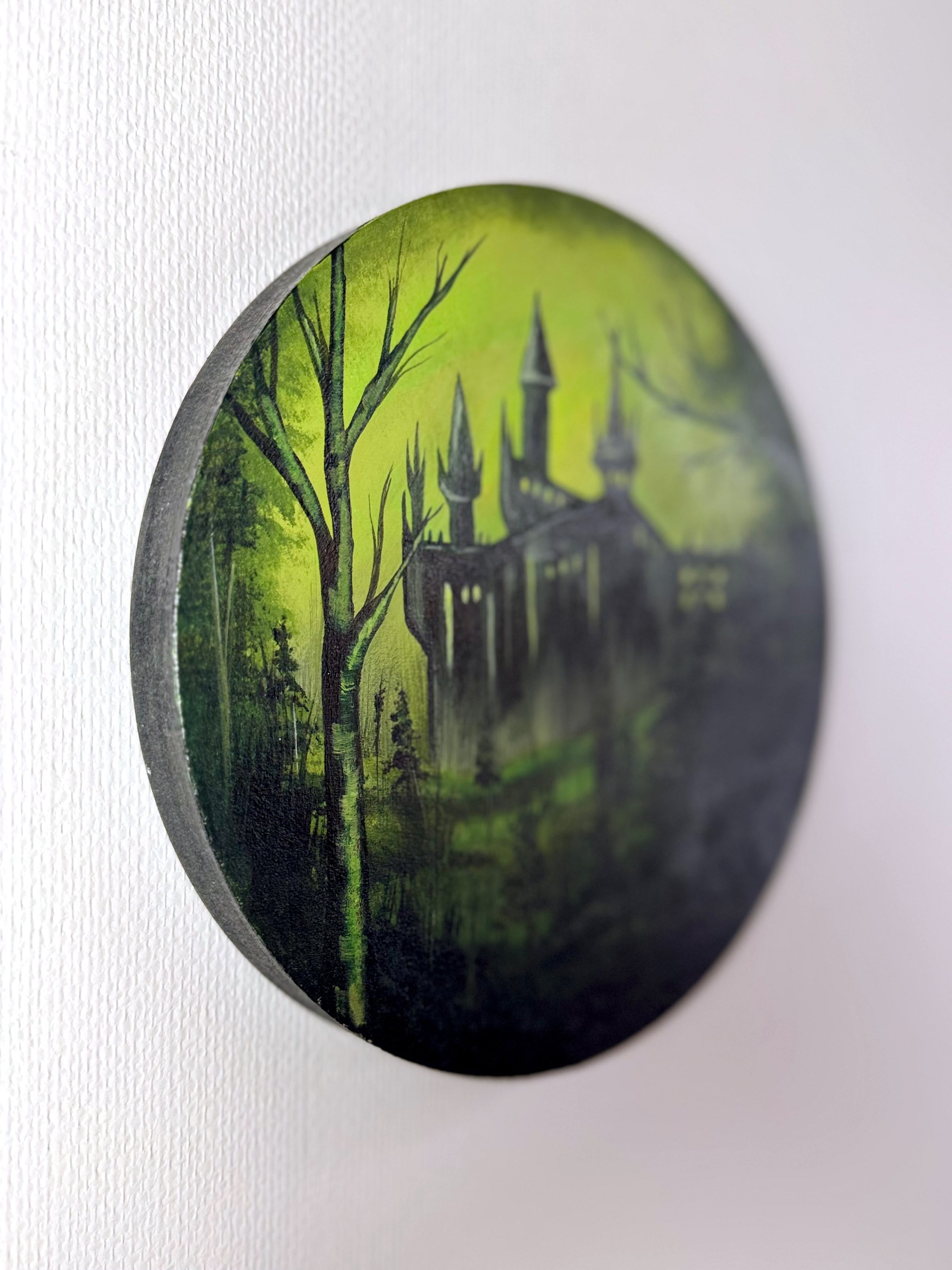 This one feels a bit like a mashup between Bob Ross and a Scooby Doo episode. It takes me back to when I watching reruns as a little kid on Saturday mornings. I can picture the portrait with the moving eyes and the knight's armor shuffling about. The vibrant green is truly jumping off the panel.