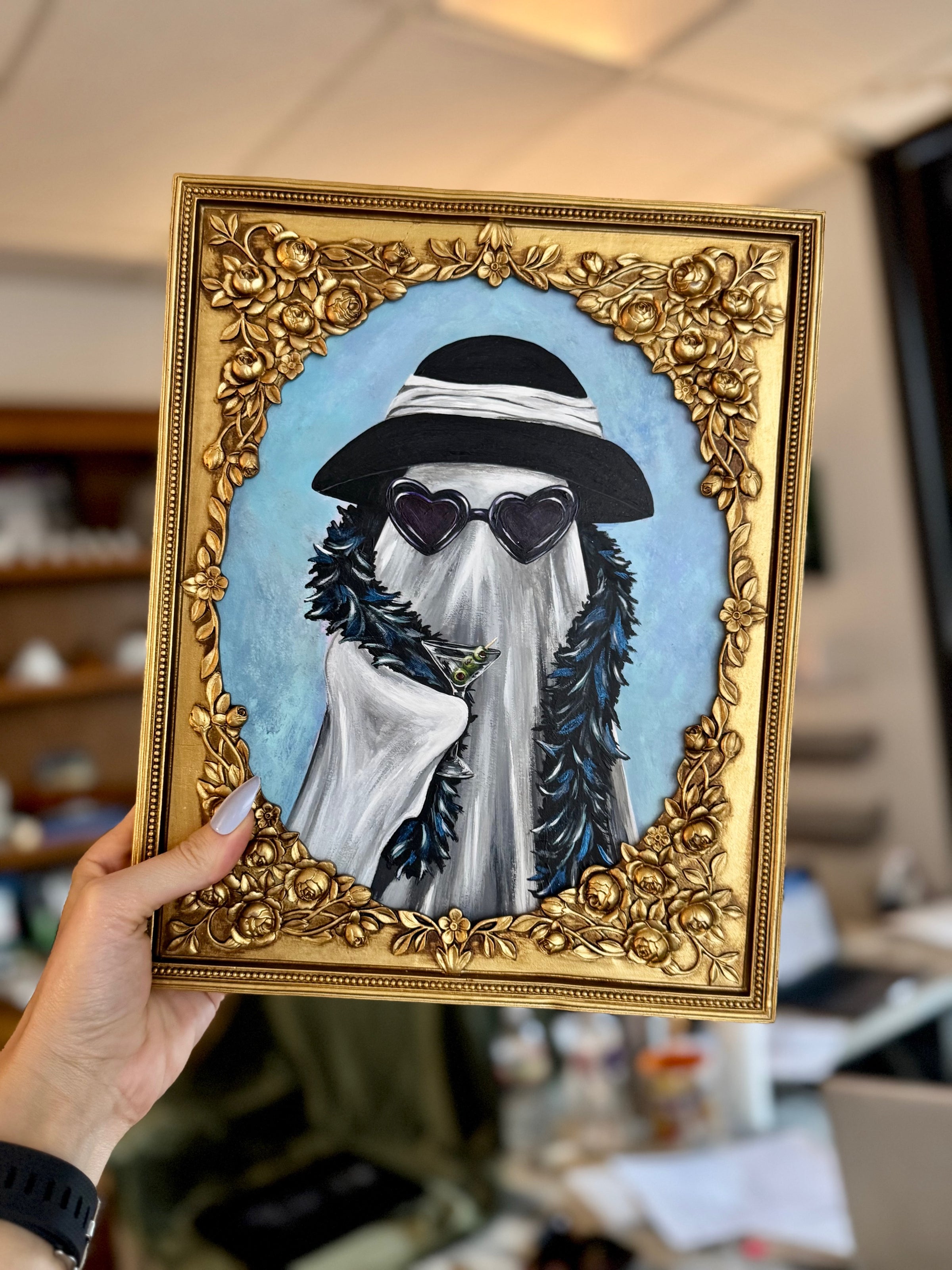 This ghost insisted on being fabulous in life and death. This charming piece features a fabulous boo adorned with black heart-shaped sunglasses, a metallic feather boa, classic hat, and of course is sipping on a bootini.