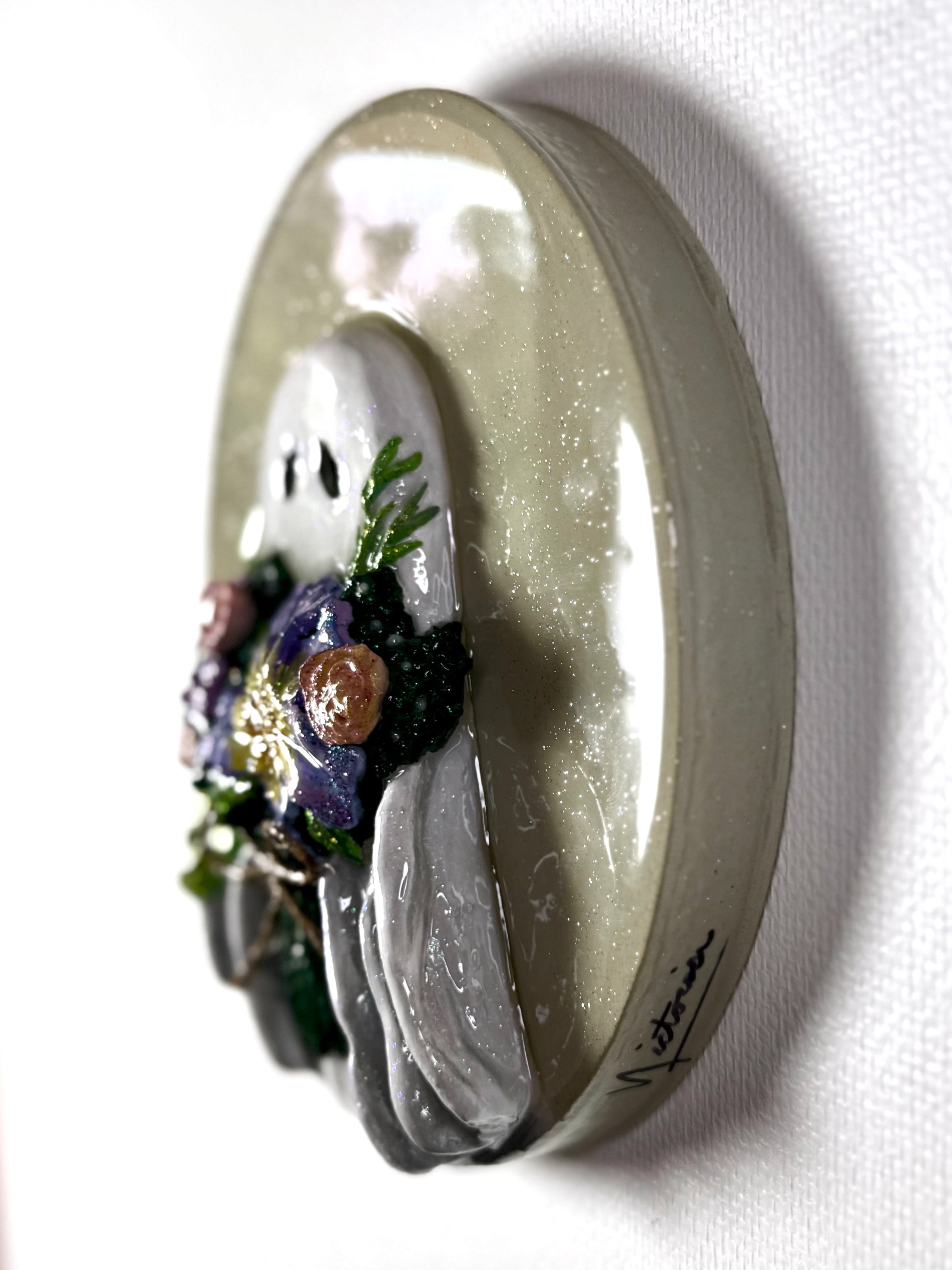 This stunning hand-crafted ghost sculpture features a glittered, light sage green background and our ghostie friend holding vibrant floral arrangement. The flowers  feature a twine bow and rhinestone embellishments to bring out the details of the sculpture.